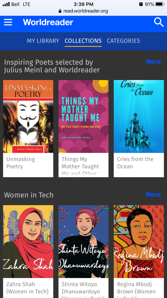 I appreciate that their financials are available for all to check out on their website – something I find very important. Also, using the four criterial from the Turner and Nann study on mobile-friendly technology, Worldreader provides an optimal web-based experience. Finally, upon browsing titles I was struck by the diversity of characters, settings and topics. Non-fiction texts about women and technology, and crime thrillers and other fiction set from Ghana to Cambodia can be found on the site. To see oneself reflected in what you read, see and hear is so very important.